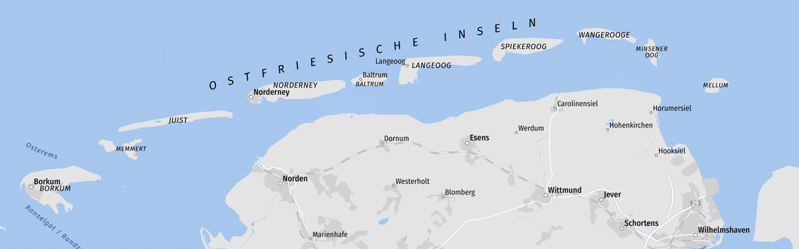 Wie an einer Perlenschnur aufgereiht liegen die sieben Ostfriesischen Inseln vor der Nordseeküste Niedersachsens.
